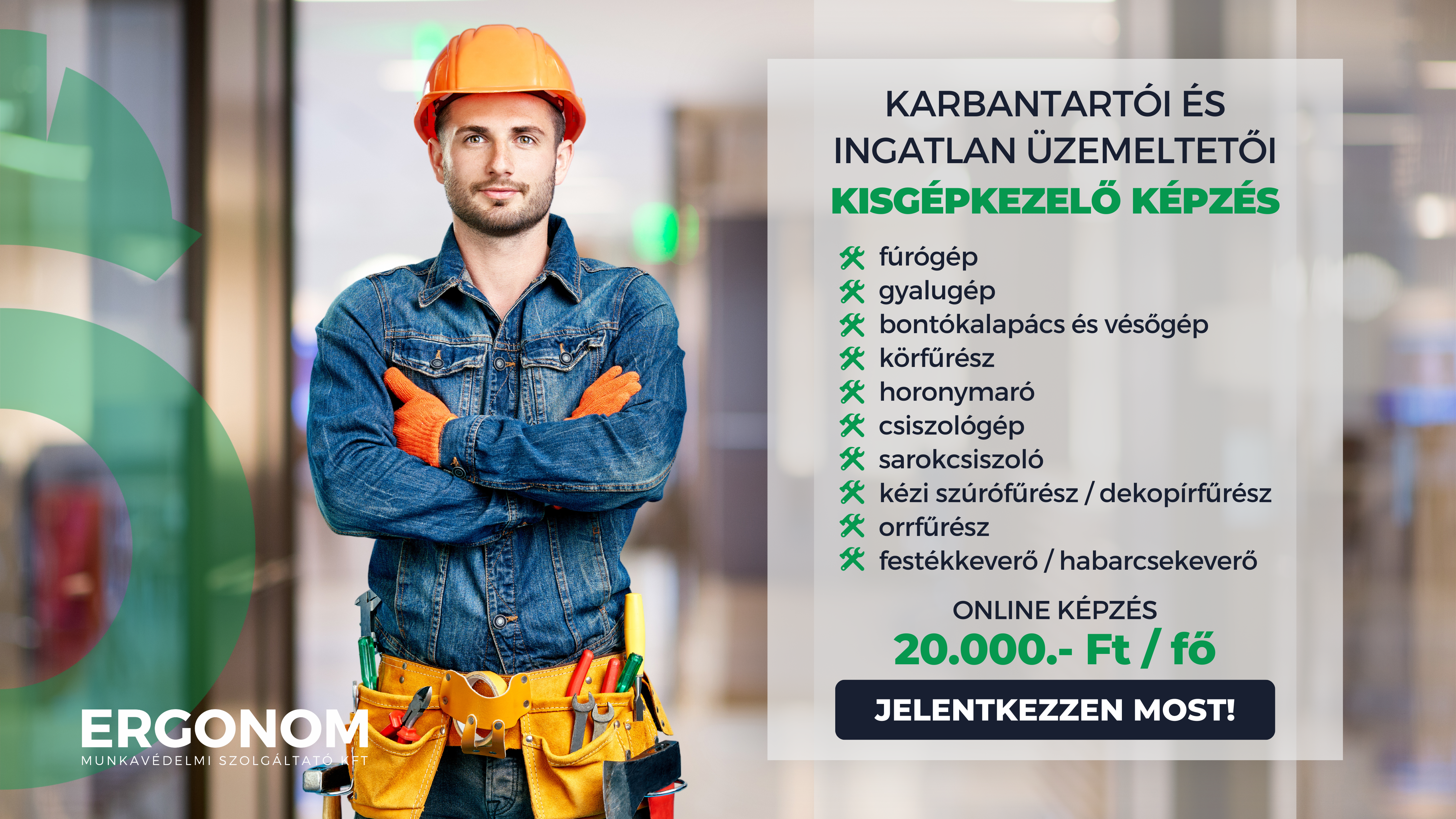A karbantartói és ingatlan üzemeltetői kisgépkezelő képzésünket az ERGONOM Munkavédelmi Szolgáltató Kft. szakmai vezetése által meghatározottak szerint valósítjuk meg online („távolléti”) képzés formájában.